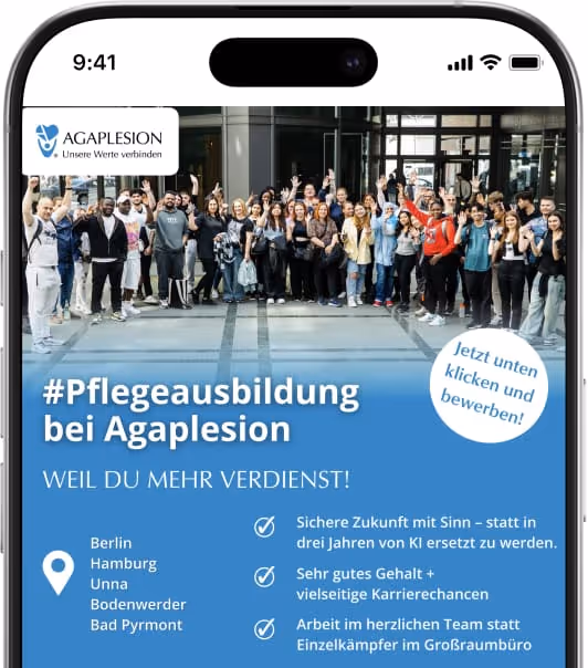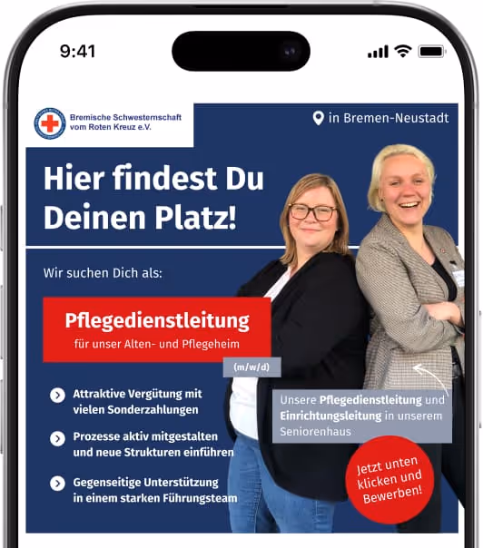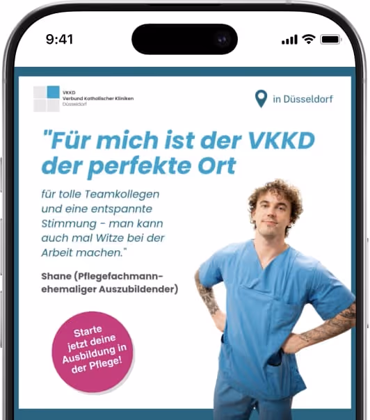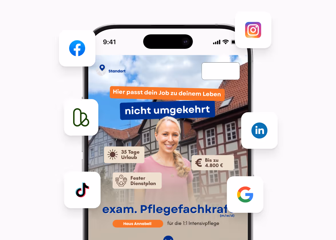 Ob Meta, TikTok, Google, Kleinanzeigen, LinkedIn oder TikTok: wir spielen Ihre Kampagnen gezielt dort aus, wo Pflegekräfte aktiv sind. Mit kreativen Inhalten, psychologischer Ansprache und präzisem Targeting sorgen wir dafür, dass Ihre Stellenangebote sichtbar werden und die passenden Kandidat:innen ansprechen.
